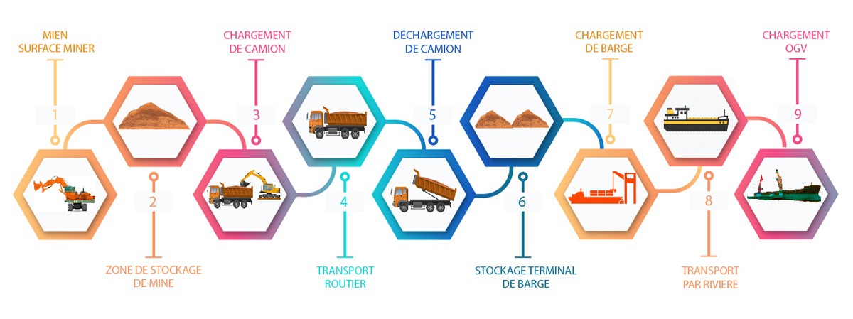 Le Projet Bon Ami produira du Minerai à Expédition Directe («MED» / «DSO»), qui sera exploité par des « surface miners » transporté via une route de transport dédiée et stocké au port fluvial. De là, le minerai sera acheminé vers une zone de transbordement en haute mer pour être transféré dans à des navires océaniques (OGV) - Cape size et Panamax.